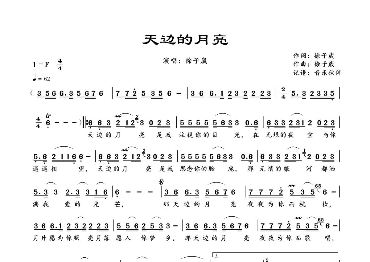 曲谱介绍: 徐子崴《天边的月亮》,音乐伙伴编配出品,共有1张高清图谱,免翻页排版设计。