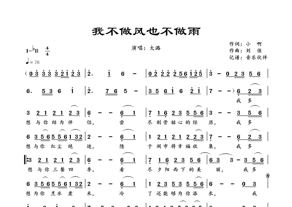 曲谱介绍: 大潞《我不做风也不做雨》,音乐伙伴编配出品,共有1张高清图谱,免翻页排版设计。