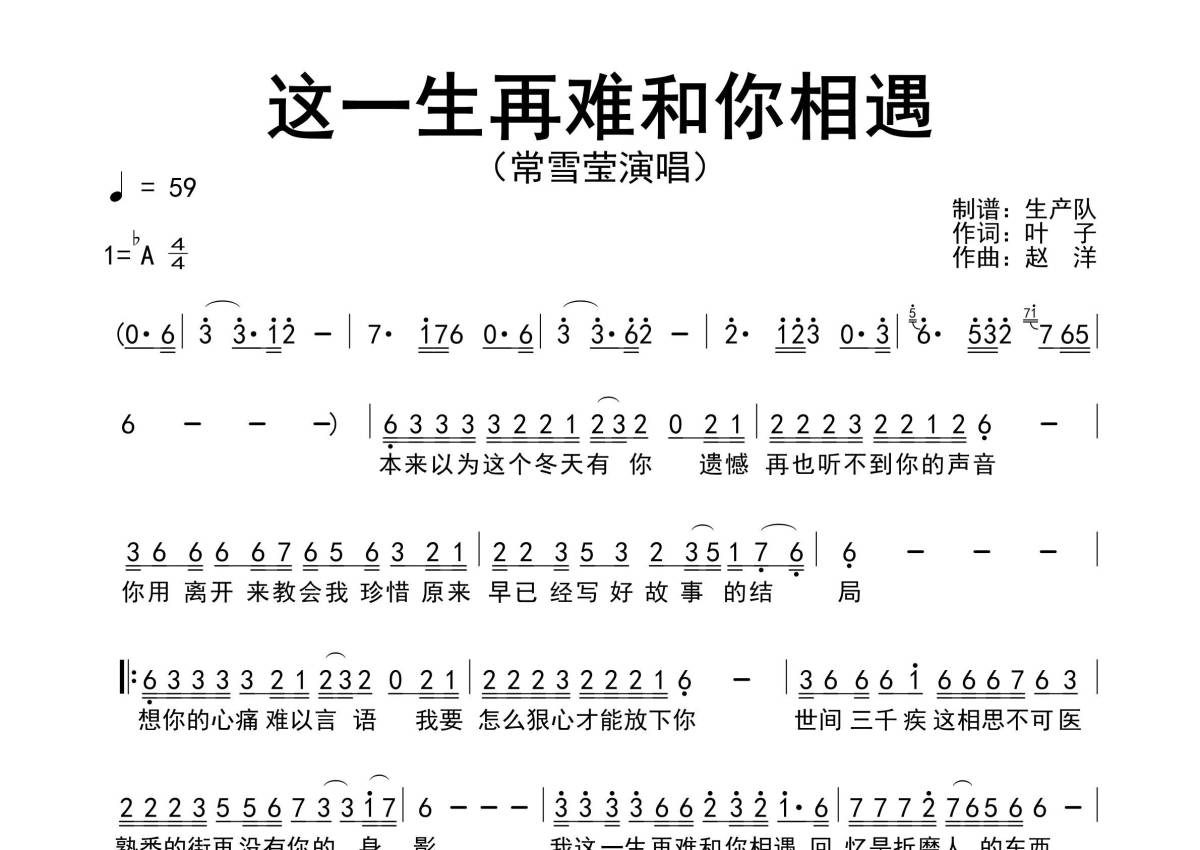 曲谱介绍: 常雪莹《这一生再难和你相遇》原版简谱,生产队编配出品,共有1张高清图谱,免翻页排版设计。