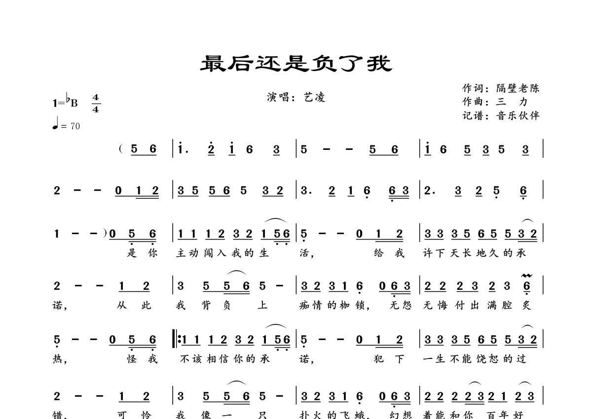 曲谱介绍: 艺凌《最后还是负了我》,音乐伙伴编配出品,共有1张高清图谱,免翻页排版设计。