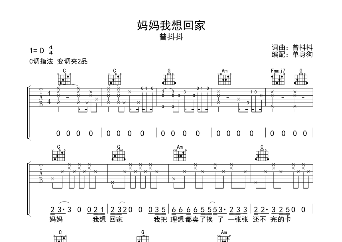 曲谱介绍: 曾抖抖《妈妈我想回家》吉他弹唱谱,采用C调指法编配,单身狗编配出品,共有4张高清图谱。