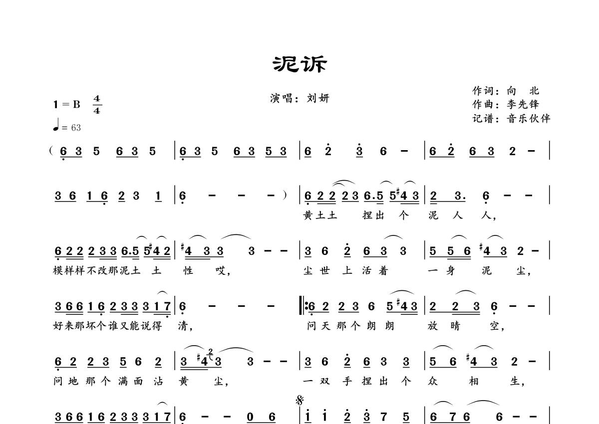 曲谱介绍: 刘妍《泥诉》,音乐伙伴编配出品,共有1张高清图谱,免翻页排版设计。
