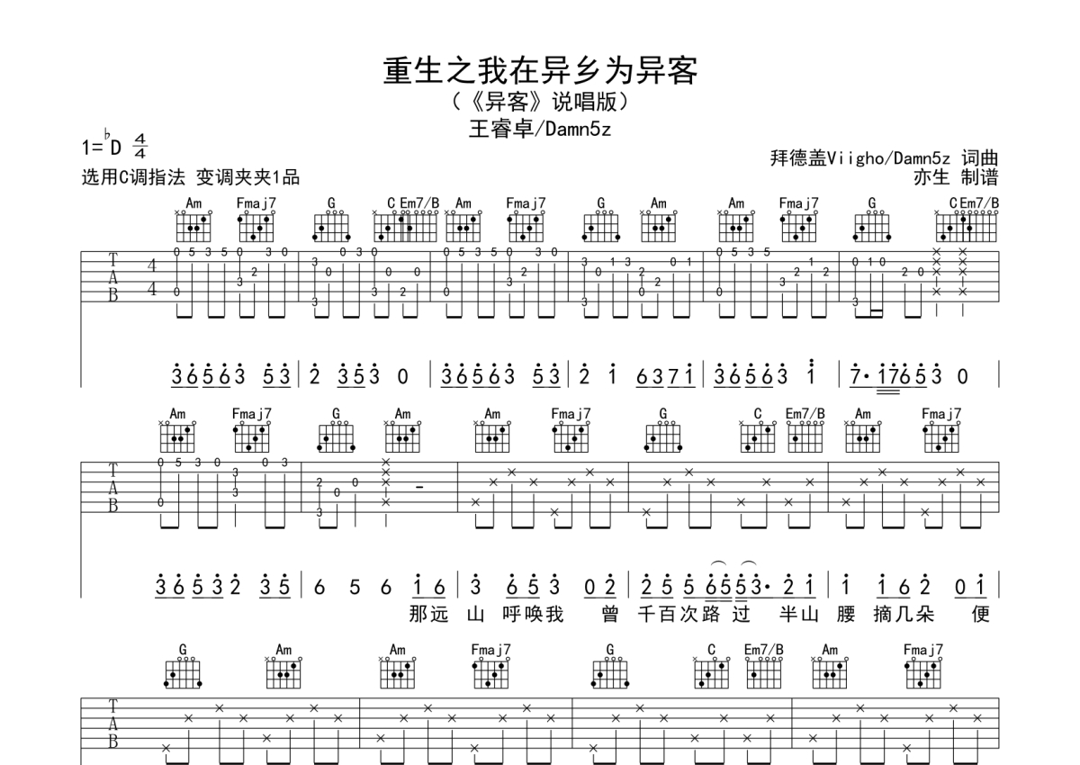 曲谱介绍: 王睿卓/Damn5z《重生之我在异乡为异客》吉他弹唱谱,采用C调指法编配,亦生编配出品,共有3张高清图谱。