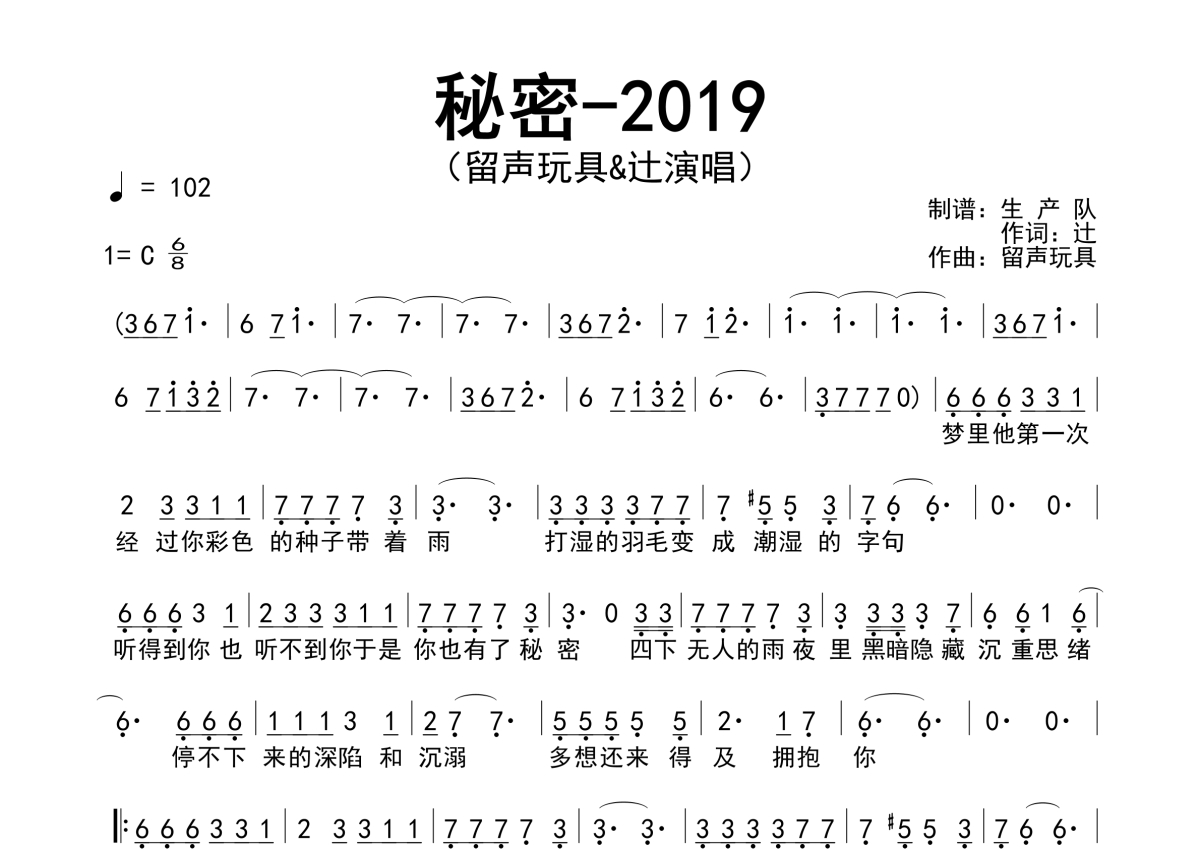 • 秘密-2019简谱 - 留声玩具 - 原版简谱第1张