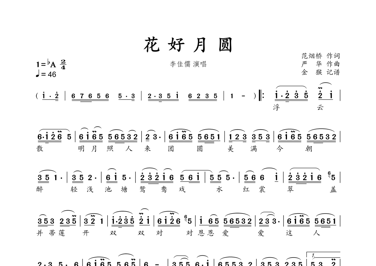曲谱介绍: 李佳儒《花好月圆》,金猴奋起千钧棒编配出品,共有1张高清图谱,免翻页排版设计。