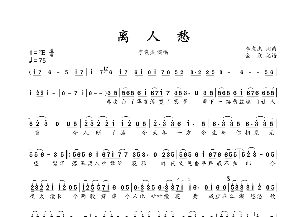 离人愁简谱 - 李袁杰