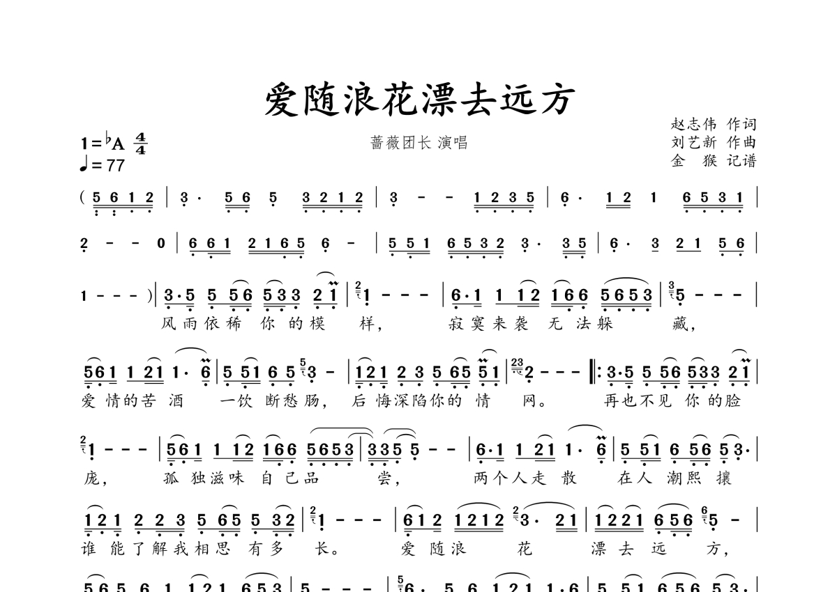曲谱介绍: 蔷薇团长《爱随浪花漂去远方》,金猴奋起千钧棒编配出品,共有1张高清图谱,免翻页排版设计。