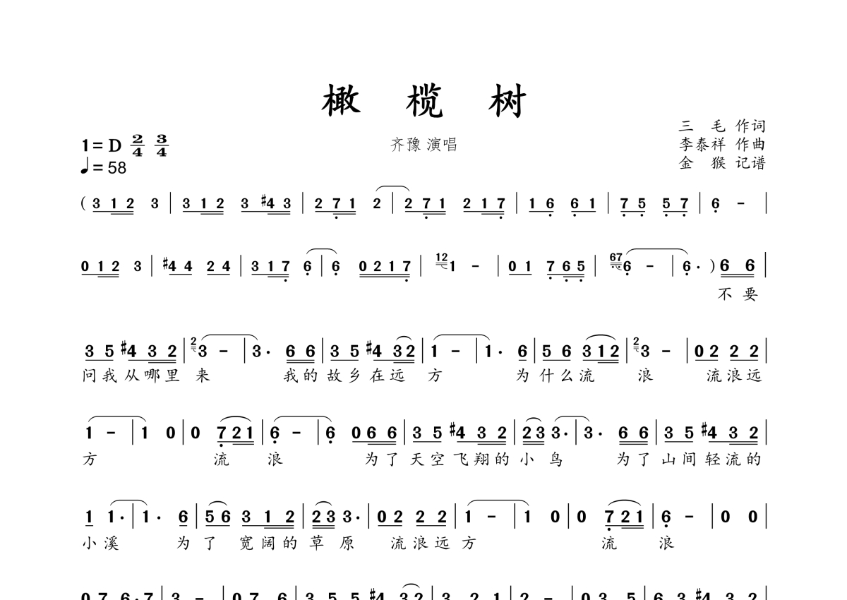 橄榄树简谱 - 齐豫