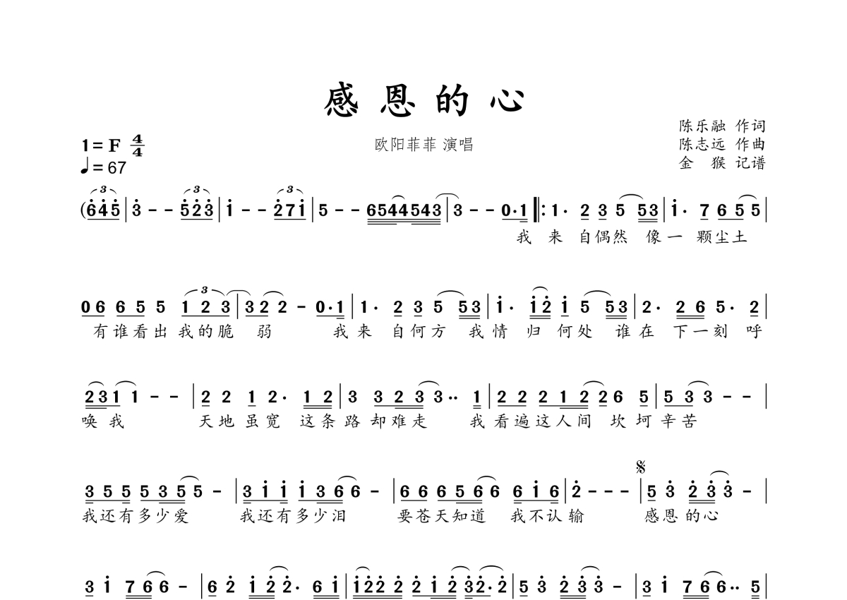 感恩的心简谱 - 欧阳菲菲