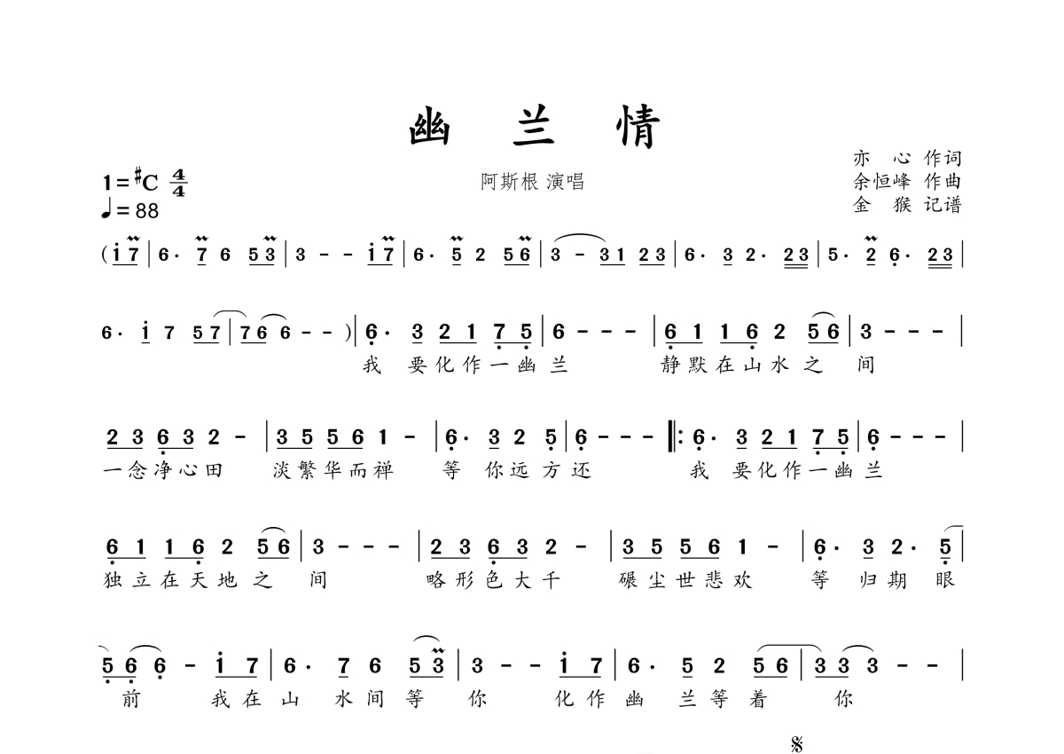 曲谱介绍: 阿斯根《幽兰情》,金猴奋起千钧棒编配出品,共有1张高清图谱,免翻页排版设计。