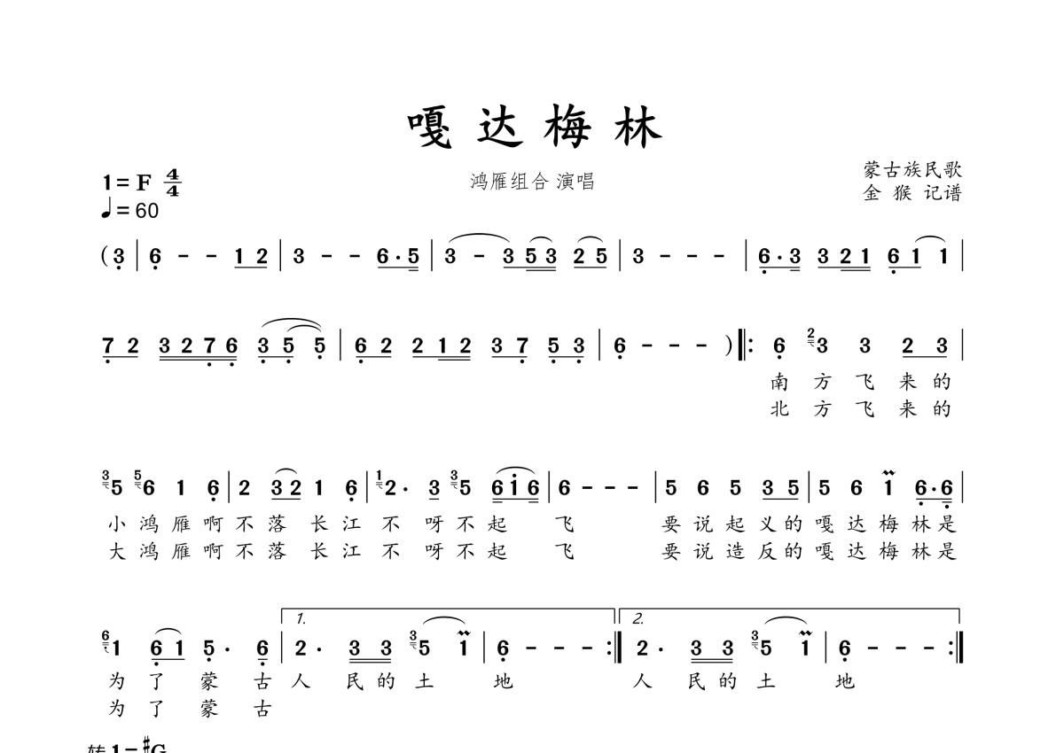 嘎达梅林简谱 - 鸿雁组合