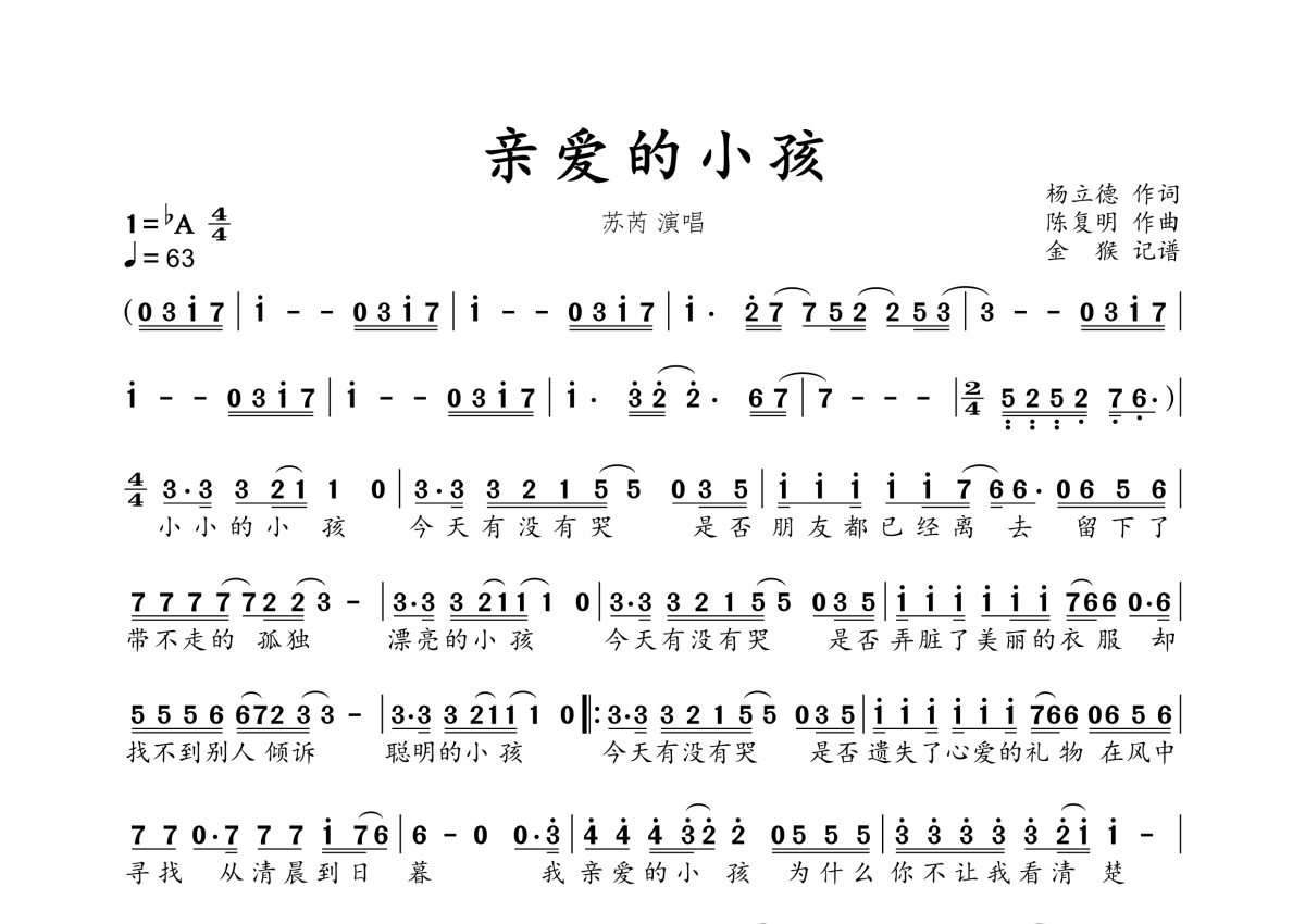 曲谱介绍: 苏芮《亲爱的小孩》,金猴奋起千钧棒编配出品,共有1张高清图谱,免翻页排版设计。