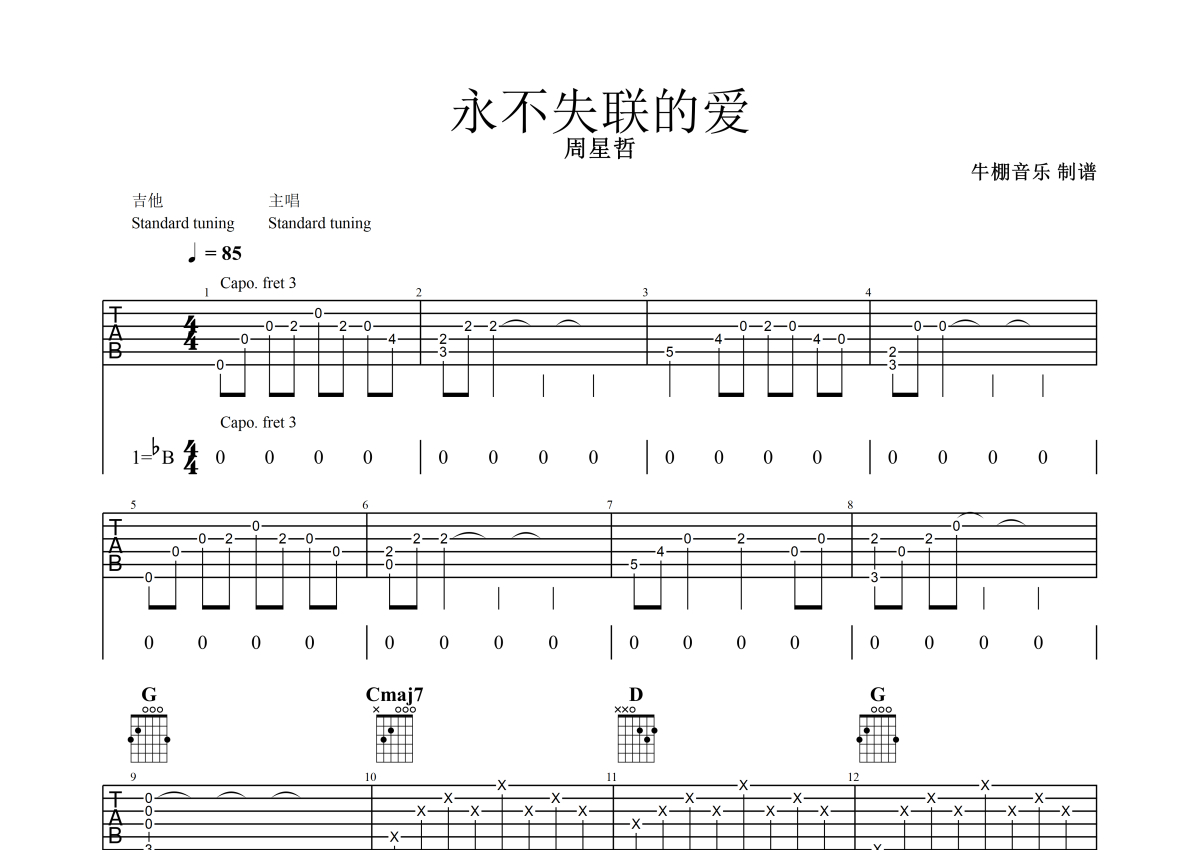 曲谱介绍: 周星哲《永不失联的爱》吉他弹唱谱,采用G调指法编配,牛棚音乐编配出品,共有2张高清图谱,免翻页排版设计。
