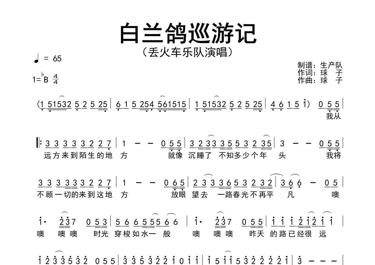 曲谱介绍: 丢火车乐队《白兰鸽巡游记》原版简谱,生产队编配出品,共有1张高清图谱,免翻页排版设计。