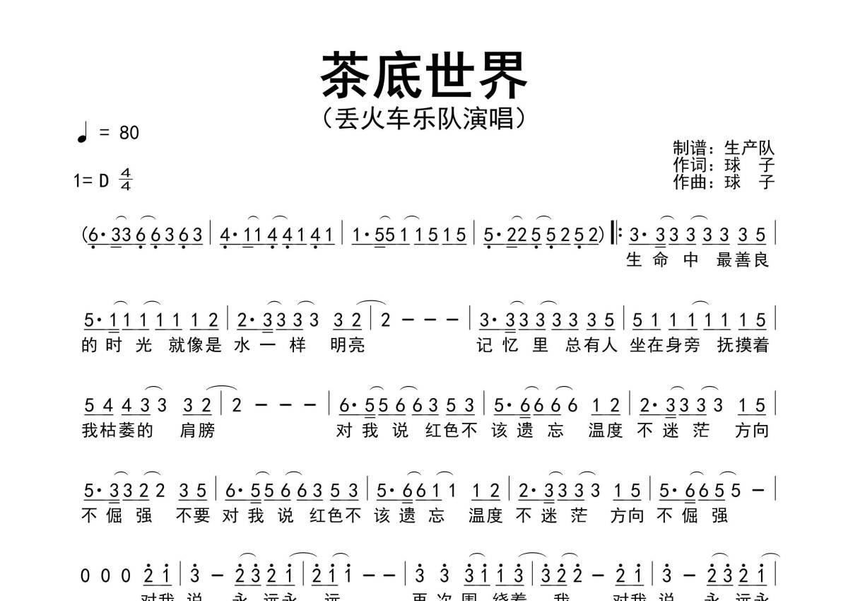 曲谱介绍: 丢火车乐队《茶底世界》原版简谱,生产队编配出品,共有1张高清图谱,免翻页排版设计。