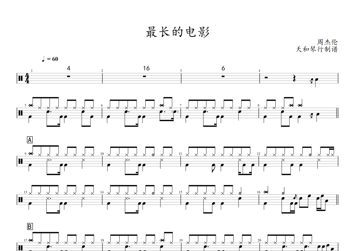 曲谱介绍: 周杰伦《最长的电影》架子鼓谱,音符喷血者编配出品,共有1张高清图谱,免翻页排版设计。