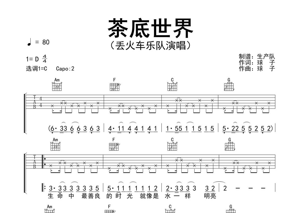 曲谱介绍: 丢火车乐队《茶底世界》吉他弹唱谱,采用C调指法编配精编完美版,生产队编配出品,共有3张高清图谱。