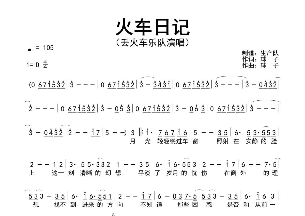 曲谱介绍: 丢火车乐队《火车日记》原版简谱,生产队编配出品,共有1张高清图谱,免翻页排版设计。