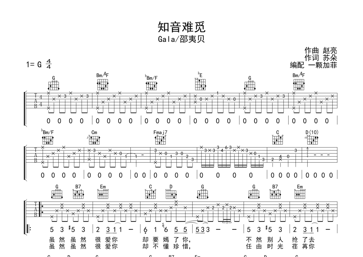曲谱介绍: GALA/邵夷贝《知音难觅》吉他弹唱谱,采用G调指法编配,一颗加菲编配出品,共有2张高清图谱,免翻页排版设计。