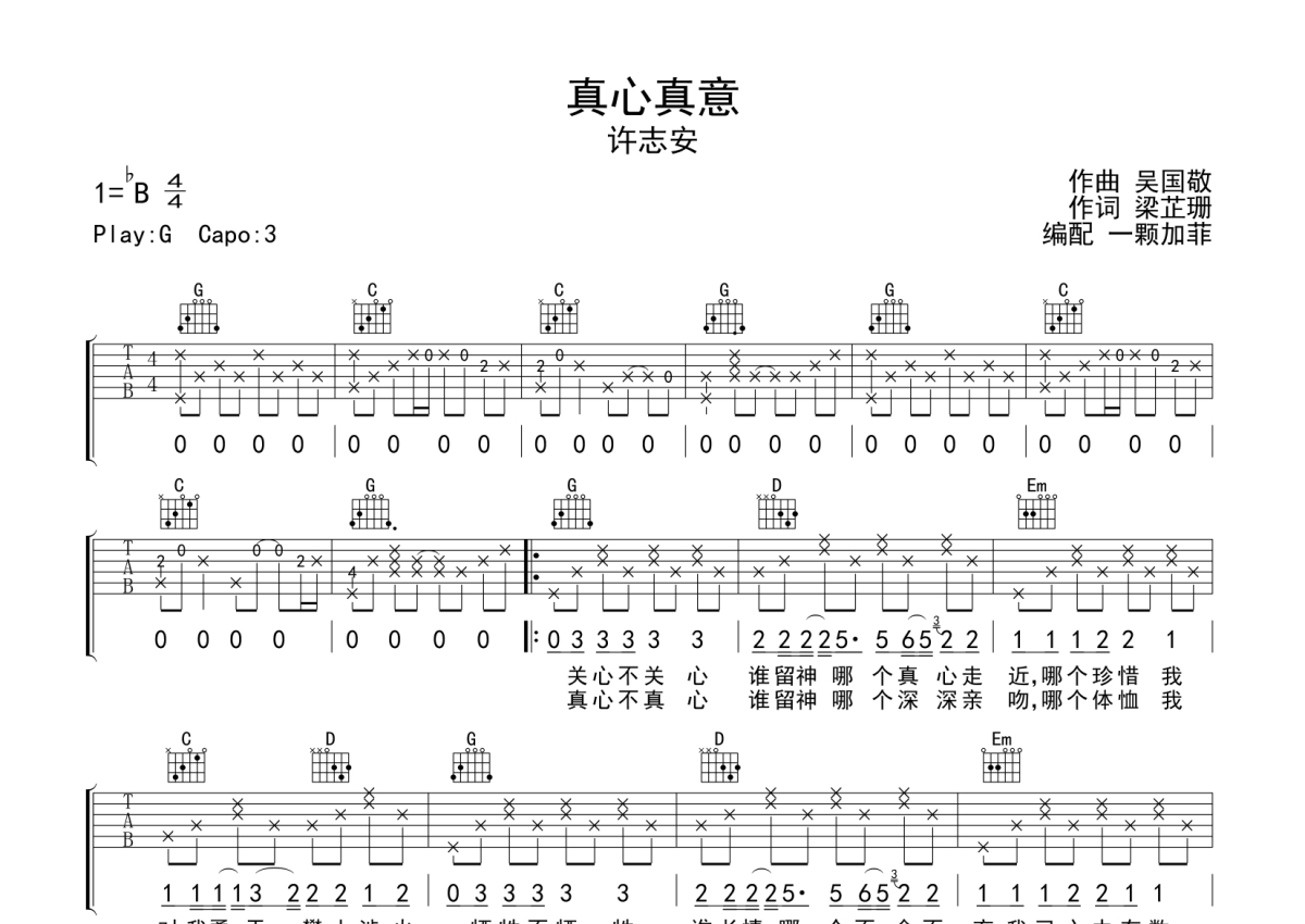 曲谱介绍: 许志安《真心真意》吉他弹唱谱,采用G调指法编配,一颗加菲编配出品,共有2张高清图谱,免翻页排版设计。