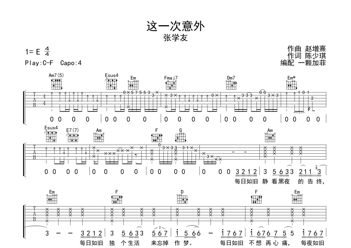 曲谱介绍: 张学友《这一次意外》吉他弹唱谱,采用C调指法编配,一颗加菲编配出品,共有2张高清图谱,免翻页排版设计。