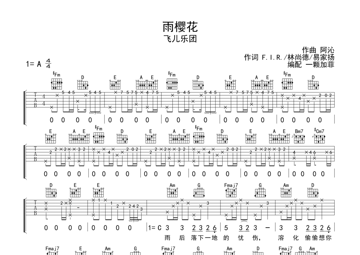 曲谱介绍: 飞儿乐团《雨樱花》吉他弹唱谱,采用A调指法编配,一颗加菲编配出品,共有3张高清图谱。