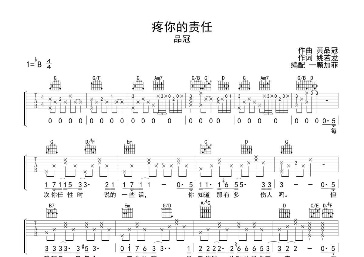 曲谱介绍: 品冠《疼你的责任》吉他弹唱谱,采用G调指法编配,一颗加菲编配出品,共有2张高清图谱,免翻页排版设计。
