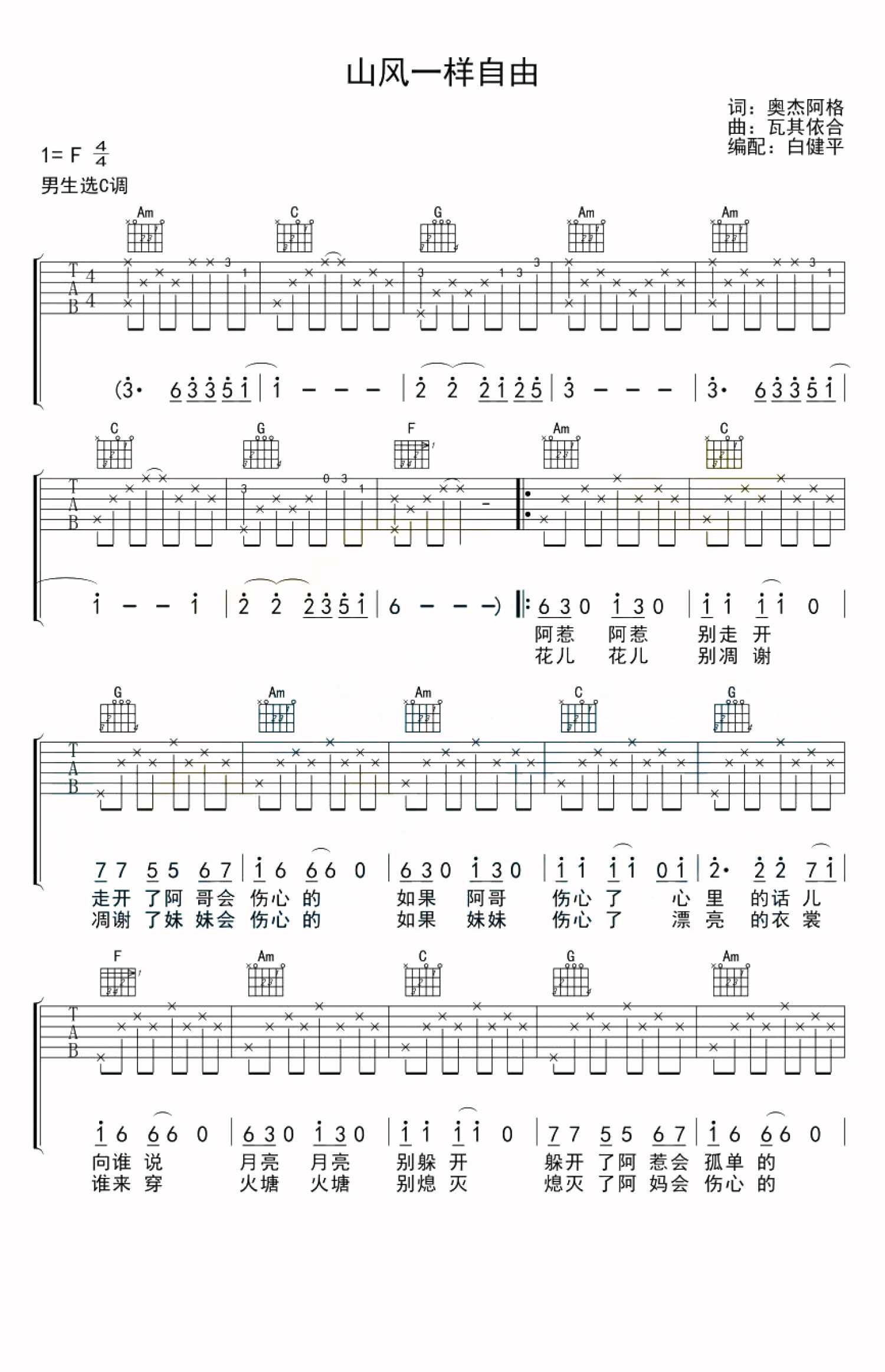 山风一样自由吉他谱 - 阿鲁阿卓 - C调吉他弹唱谱 - 男生版