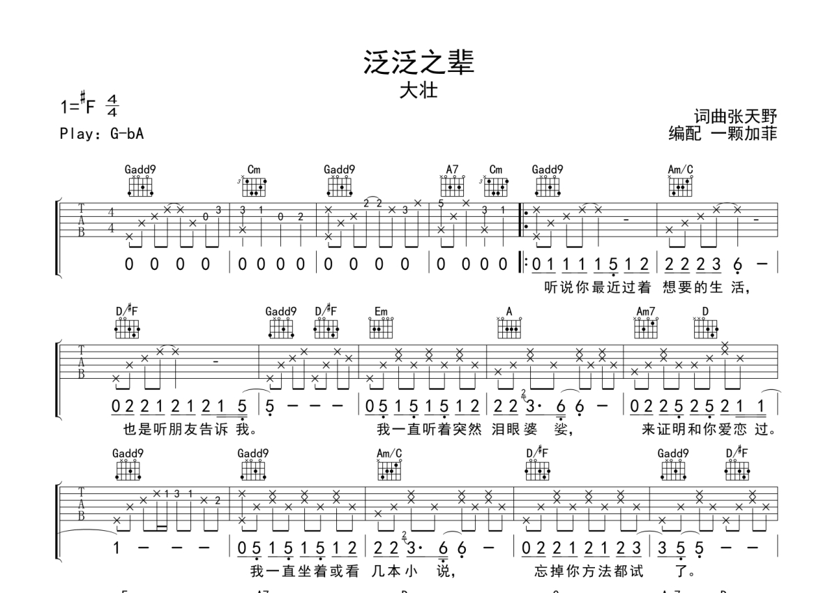 曲谱介绍: 大壮《泛泛之辈》吉他弹唱谱,采用G调指法编配,一颗加菲编配出品,共有2张高清图谱,免翻页排版设计。