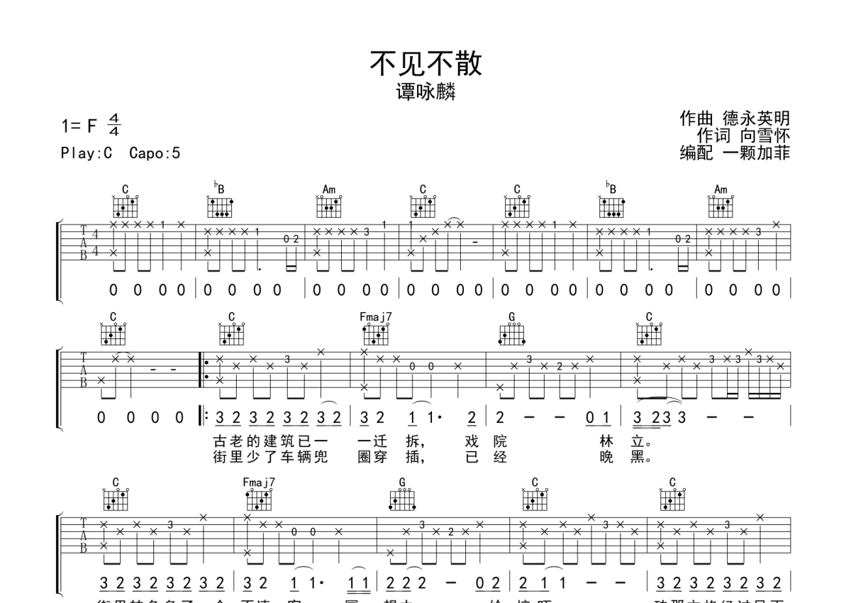 曲谱介绍: 谭咏麟《不见不散》吉他弹唱谱,采用C调指法编配,一颗加菲编配出品,共有2张高清图谱,免翻页排版设计。