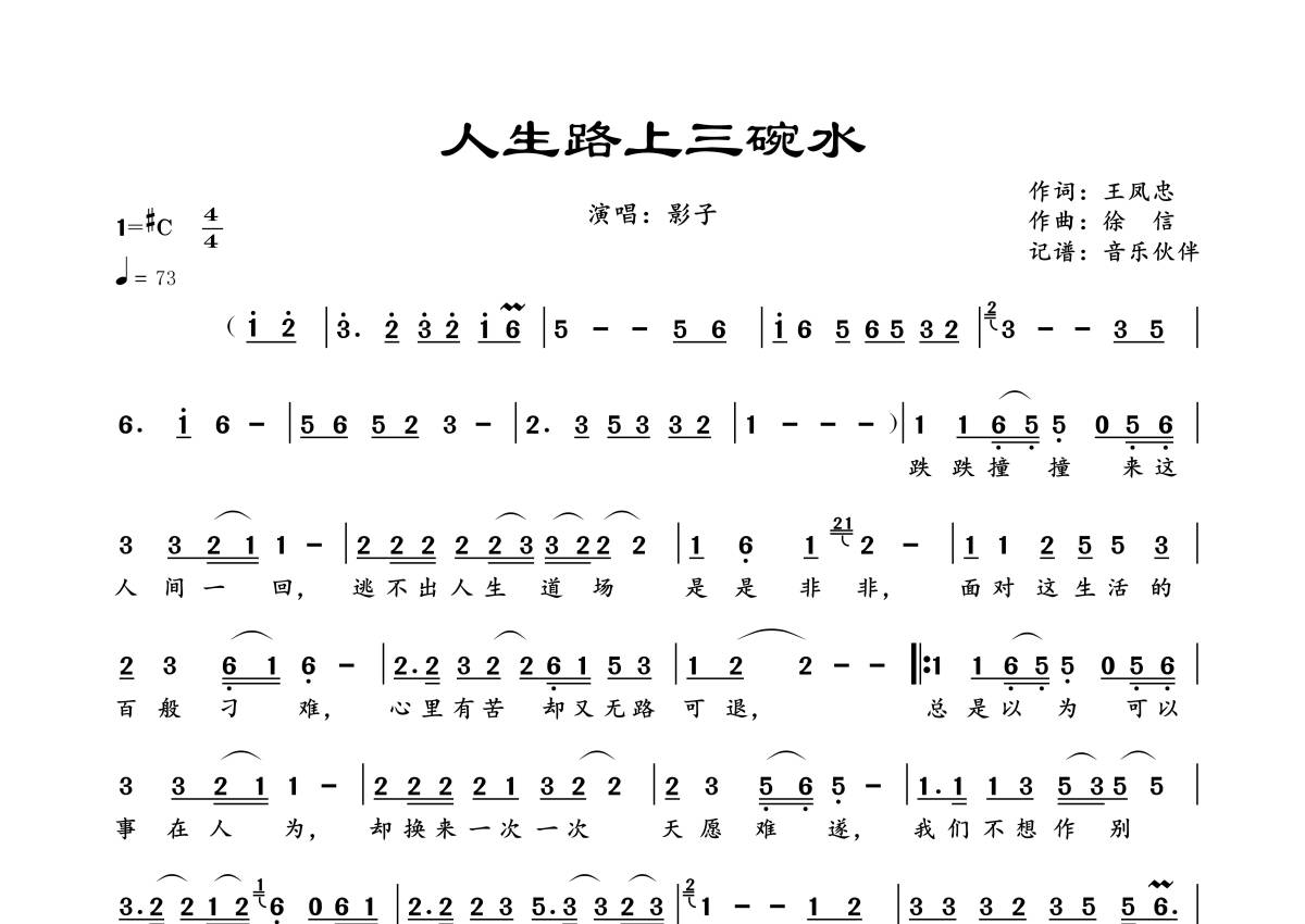 曲谱介绍: 影子《人生路上三碗水》,音乐伙伴编配出品,共有1张高清图谱,免翻页排版设计。