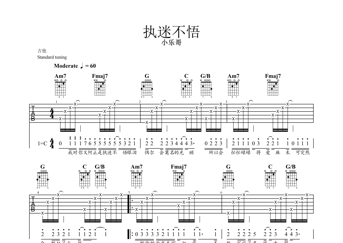• 执迷不悟吉他谱 - 小乐哥 - C调吉他弹唱谱第1张