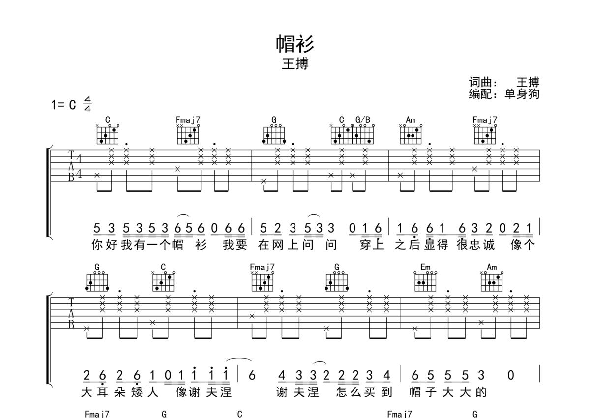 曲谱介绍: 王博《帽衫》吉他弹唱谱,采用C调指法编配,单身狗编配出品,共有2张高清图谱,免翻页排版设计。