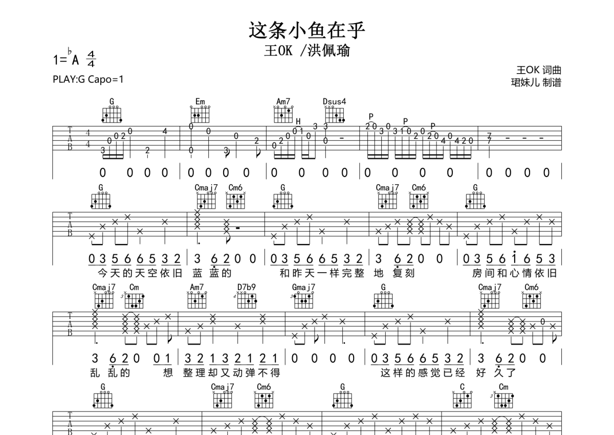 曲谱介绍: 王OK/洪佩瑜《这条小鱼在乎》吉他弹唱谱,采用G调指法编配,珺妹儿编配出品,共有2张高清图谱,免翻页排版设计。