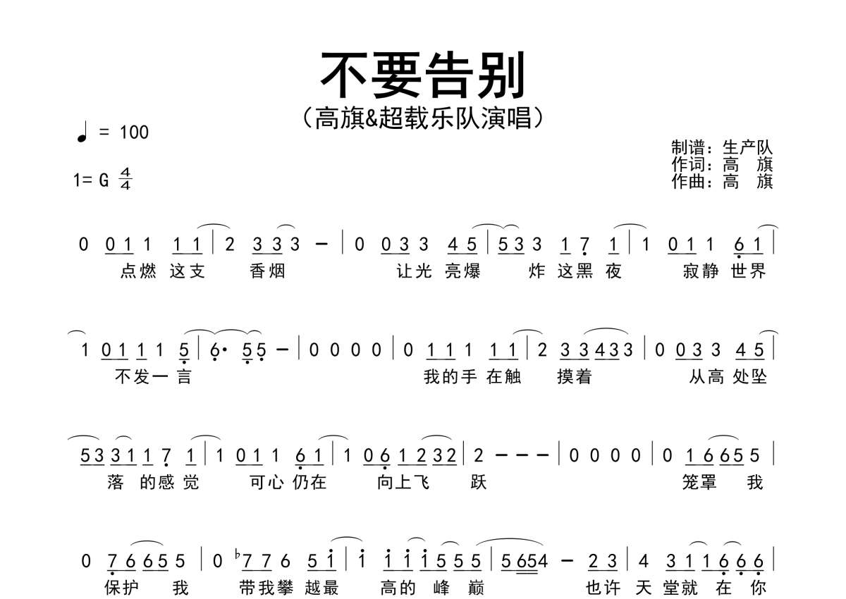 曲谱介绍: 超载乐队/高旗《不要告别》,生产队编配出品,共有2张高清图谱,免翻页排版设计。