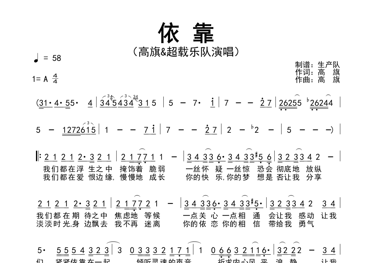 曲谱介绍: 超载乐队/高旗《依靠》,生产队编配出品,共有1张高清图谱,免翻页排版设计。