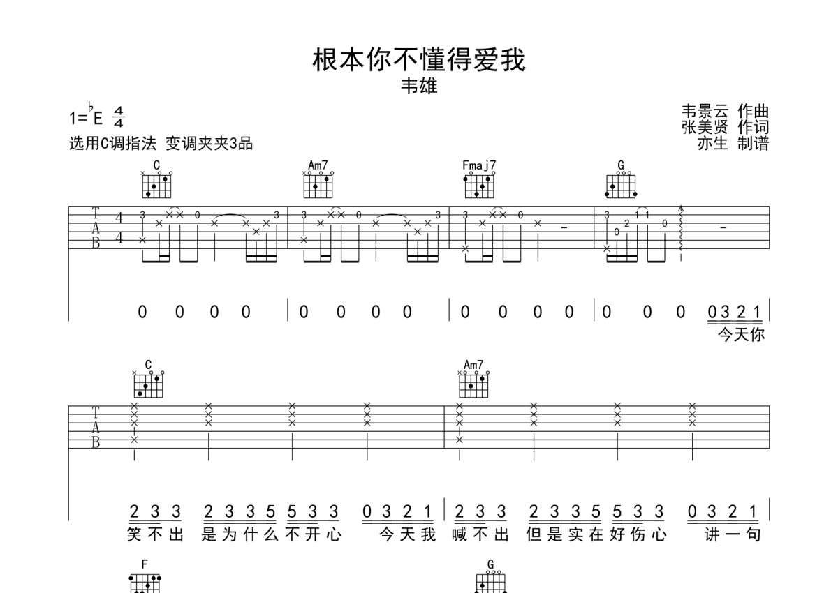 曲谱介绍: 韦雄《根本你不懂得爱我》吉他弹唱谱,采用C调指法编配,亦生编配出品,共有3张高清图谱。
