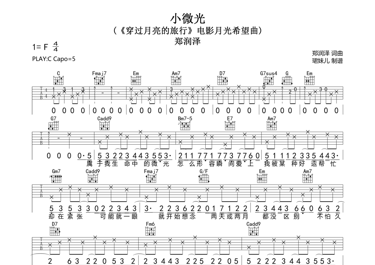 • 小微光吉他谱 - 郑润泽 - C调吉他弹唱谱第1张