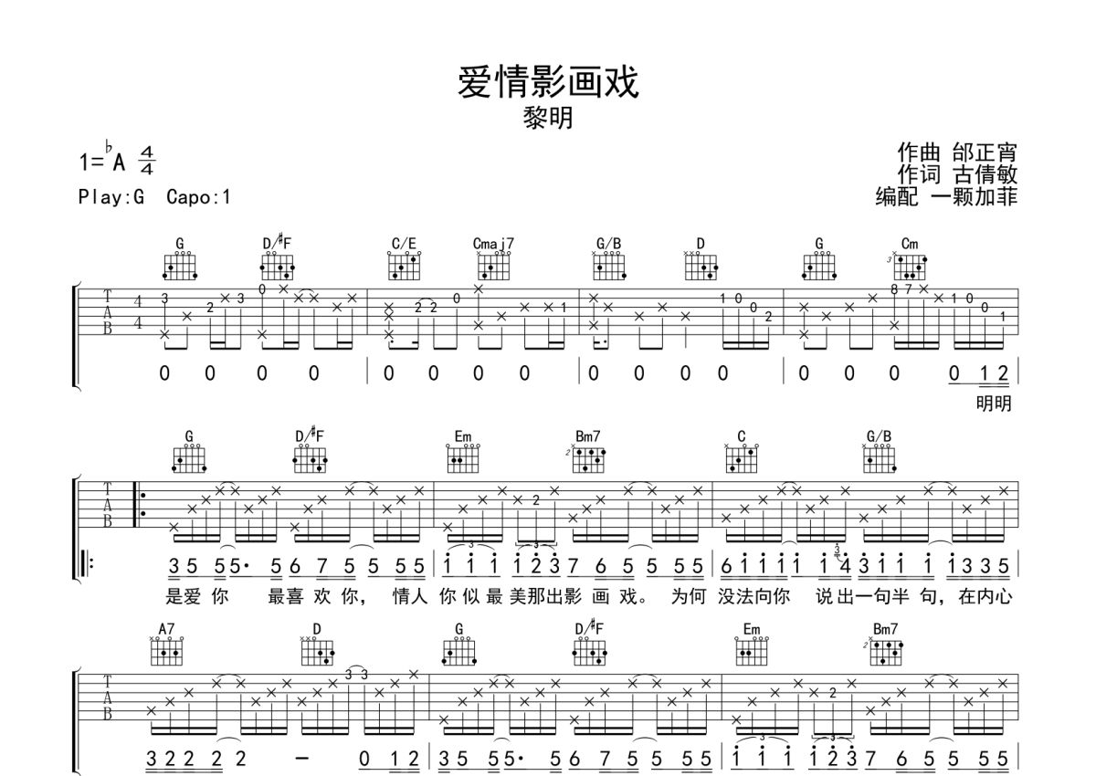 曲谱介绍: 黎明《爱情影画戏》吉他弹唱谱,采用G调指法编配,一颗加菲编配出品,共有2张高清图谱,免翻页排版设计。