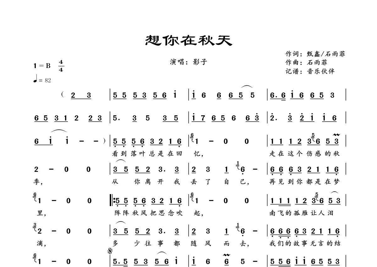 曲谱介绍: 影子《想你在秋天》,音乐伙伴编配出品,共有1张高清图谱,免翻页排版设计。