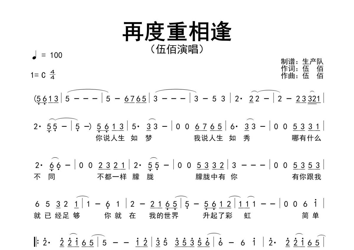 曲谱介绍: 伍佰《再度重相逢》原版简谱,生产队编配出品,共有1张高清图谱,免翻页排版设计。