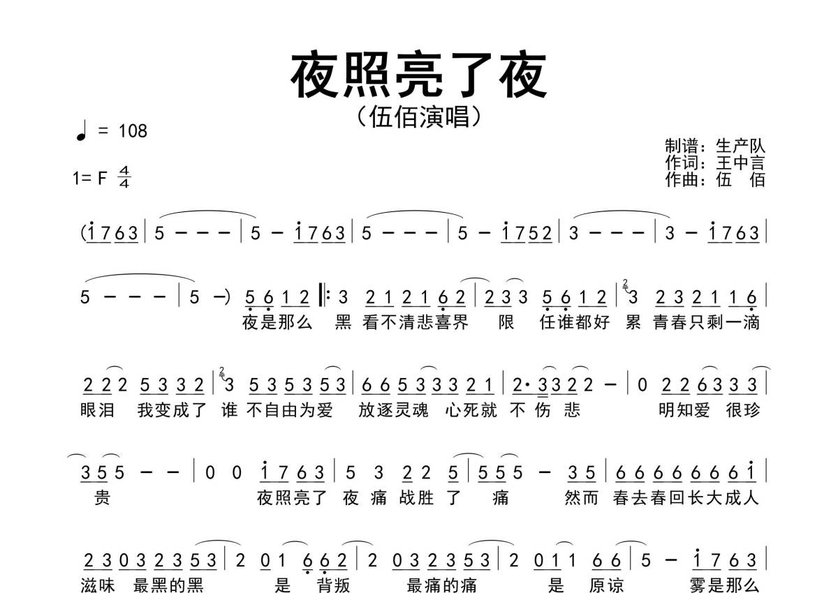 曲谱介绍: 伍佰《夜照亮了夜》原版简谱,生产队编配出品,共有1张高清图谱,免翻页排版设计。