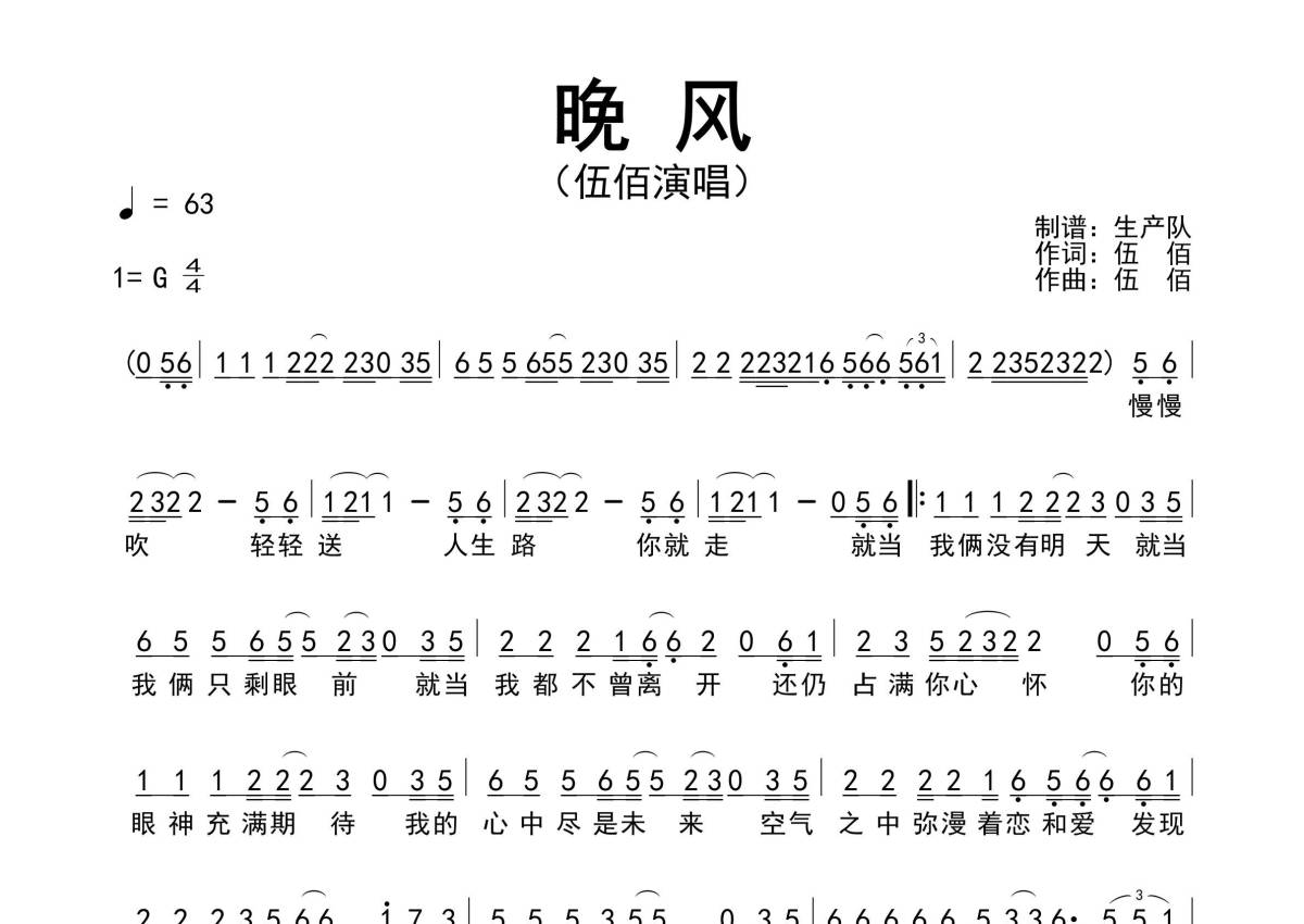 曲谱介绍: 伍佰《晚风》原版简谱,生产队编配出品,共有1张高清图谱,免翻页排版设计。