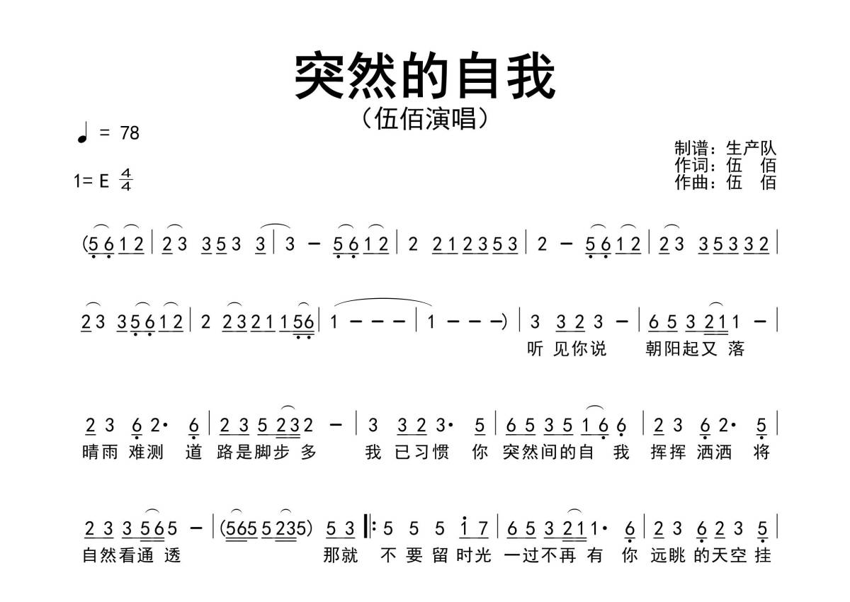 曲谱介绍: 伍佰《突然的自我》原版简谱,生产队编配出品,共有1张高清图谱,免翻页排版设计。