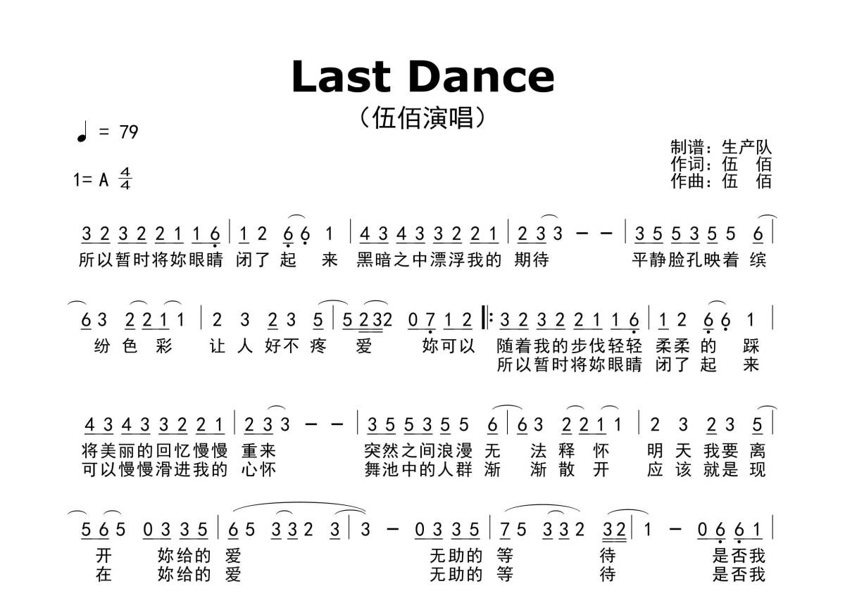 曲谱介绍: 伍佰《LastDance》原版简谱,生产队编配出品,共有1张高清图谱,免翻页排版设计。