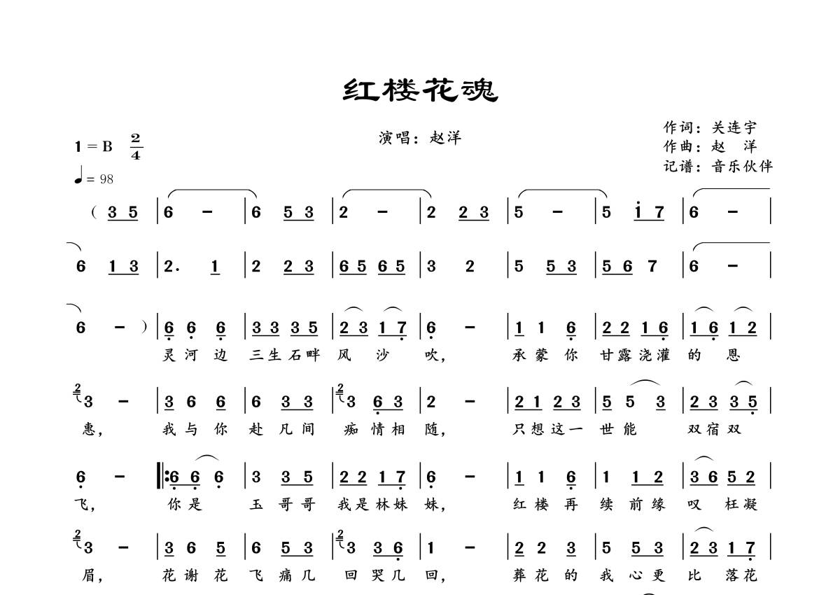 曲谱介绍: 赵洋《红楼花魂》,音乐伙伴编配出品,共有1张高清图谱,免翻页排版设计。