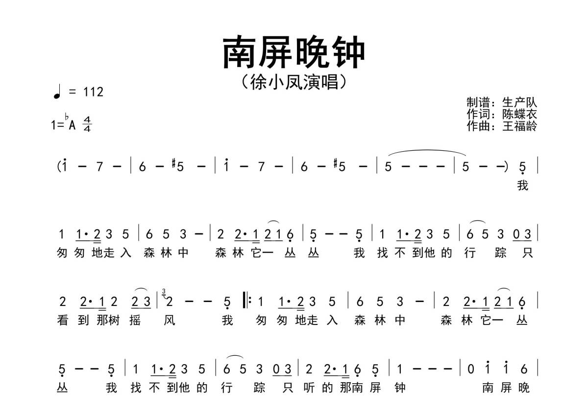 曲谱介绍: 徐小凤《南屏晚钟》原版简谱,生产队编配出品,共有1张高清图谱,免翻页排版设计。