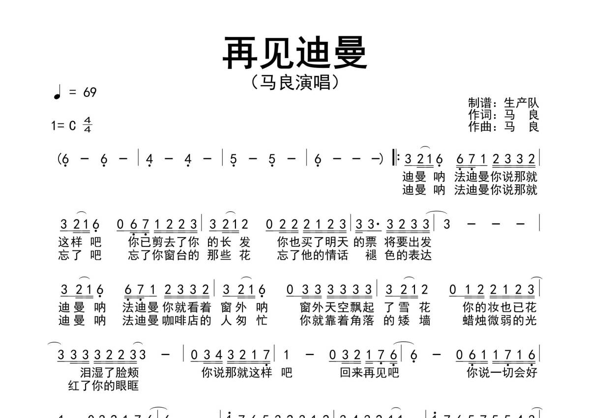 曲谱介绍: 马良《再见迪曼》原版简谱,生产队编配出品,共有1张高清图谱,免翻页排版设计。