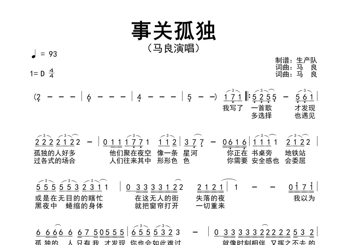 曲谱介绍: 马良《事关孤独》原版简谱,生产队编配出品,共有1张高清图谱,免翻页排版设计。