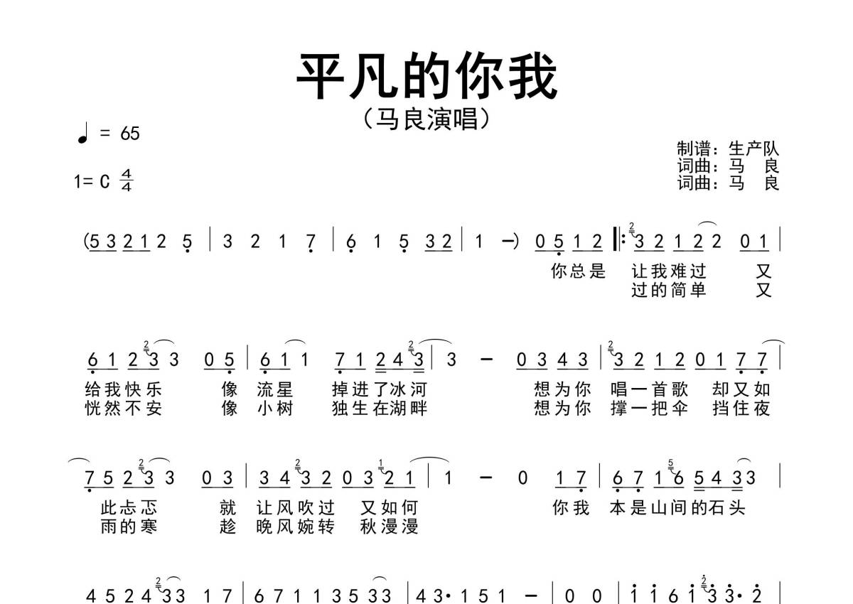 • 平凡的你我简谱 - 马良 - 原版简谱第1张